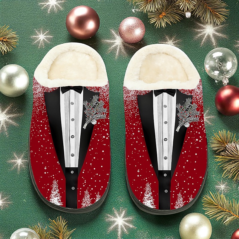 Men's Christmas Suit Slippers - Festive Red Bow Tie Design Warm Fleece Indoor Shoes, Cozy Holiday Home Footwear for Winter and Christmas Gifts