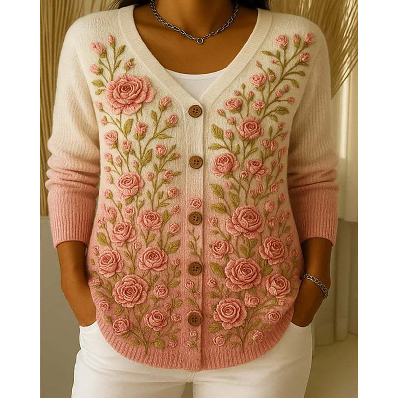 Women's Sweater Cardigan Streetwear Casual Floral Ribbed V Neck Knitted Print Long Sleeve Regular Tops Knit Daily Holiday Going out Hot Pink White Fall Winter