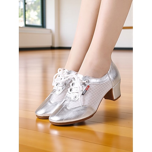 scarpe da ballo da sala da donna con lacci color argento - comode scarpe da allenamento latine con tacco basso per salsa, tango e spettacoli sul palco