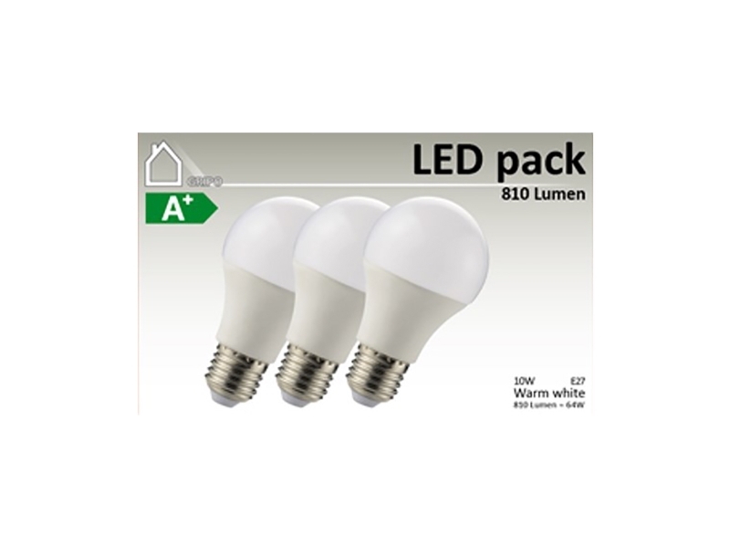 GRIPO LED pære A60 E27 10W CRI80 3stk 3000K 810Lm > 270gr. 60x120 2835SMD 18stk - 1698630