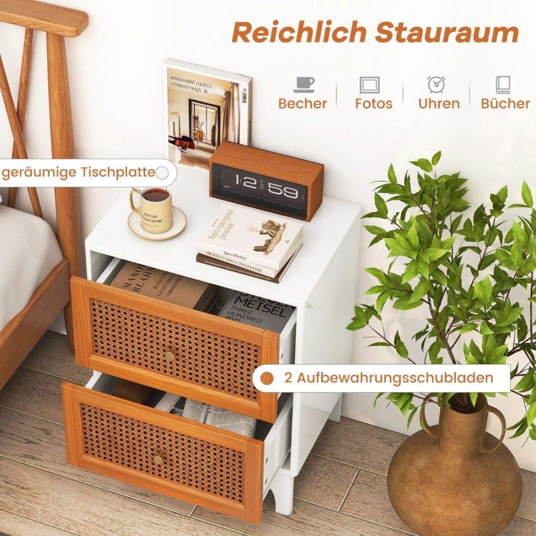 Sengebord sengeskab i rattan med 2 skuffer sidebord med massive træben 46 x 33 x 59,5 cm hvid + brun