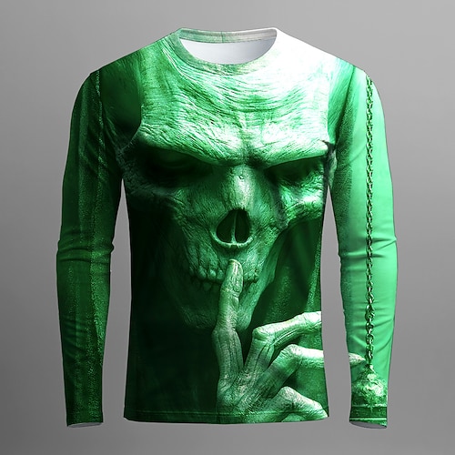 Halloween Herren Schädel Optische Täuschung 3D T Shirt Langarm T-Shirt 3D-Druck Rundhalsausschnitt Hemd Mode Übertrieben Straße Lässig Täglich Hellblau Blau Grün Sommer Frühling Herbst Bekleidung S M