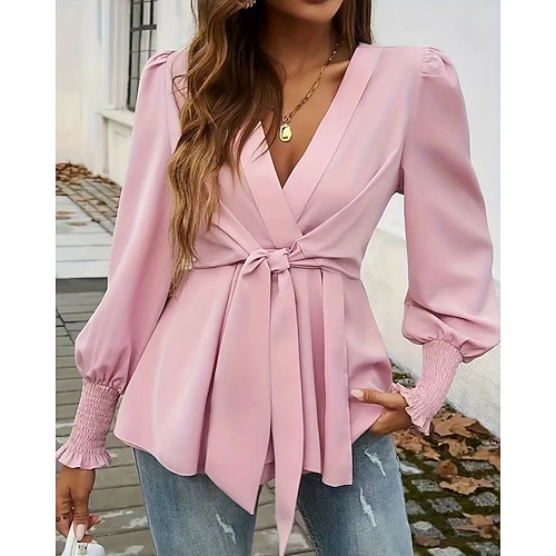 Per donna Blusa Top Eleganti Tinta unica Semplice Elegante Vintage Quotidiano Manica Lunga Scollo a V Top Regolari Lavoro Quotidiano Ferie Allacciato Arricciato Tunica Nero Rosa Vino Verde Autunno