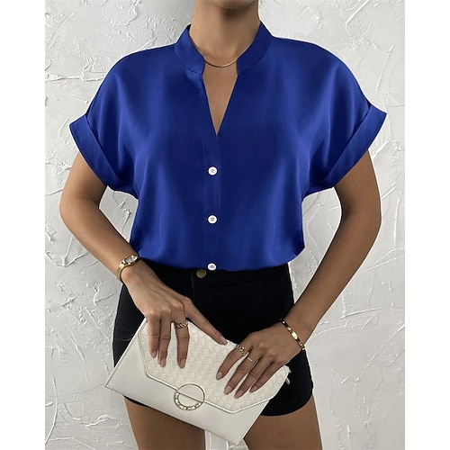 Per donna Blusa Top Eleganti Tinta unica Semplice Elegante Vintage Quotidiano Manica Corta Scollo a V Top Regolari Quotidiano Lavoro Ferie Arricciato Bottoni Drappeggiato Blu Nero Rosa Arancione Verde