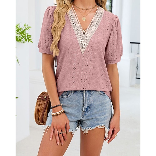 Per donna Maglietta Top estivi Tinta unica Elegante Moda Classico Manica Corta Scollo a V Top Regolari Quotidiano Uscire Weekend Patchwork Traforato Blu Nero Bianco Rosa Viola Estate Primavera