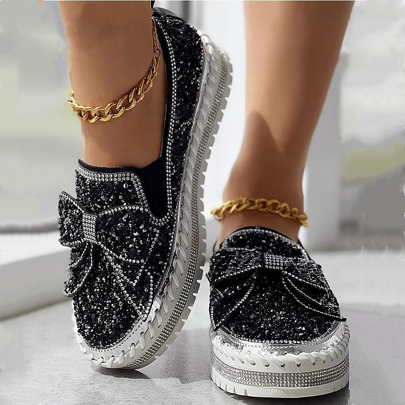 Women's Sparkly Rhinestone Slip-On Sneakers – Glitter Bow Platform Loafers for Party, Casual Streetwear Fashion
