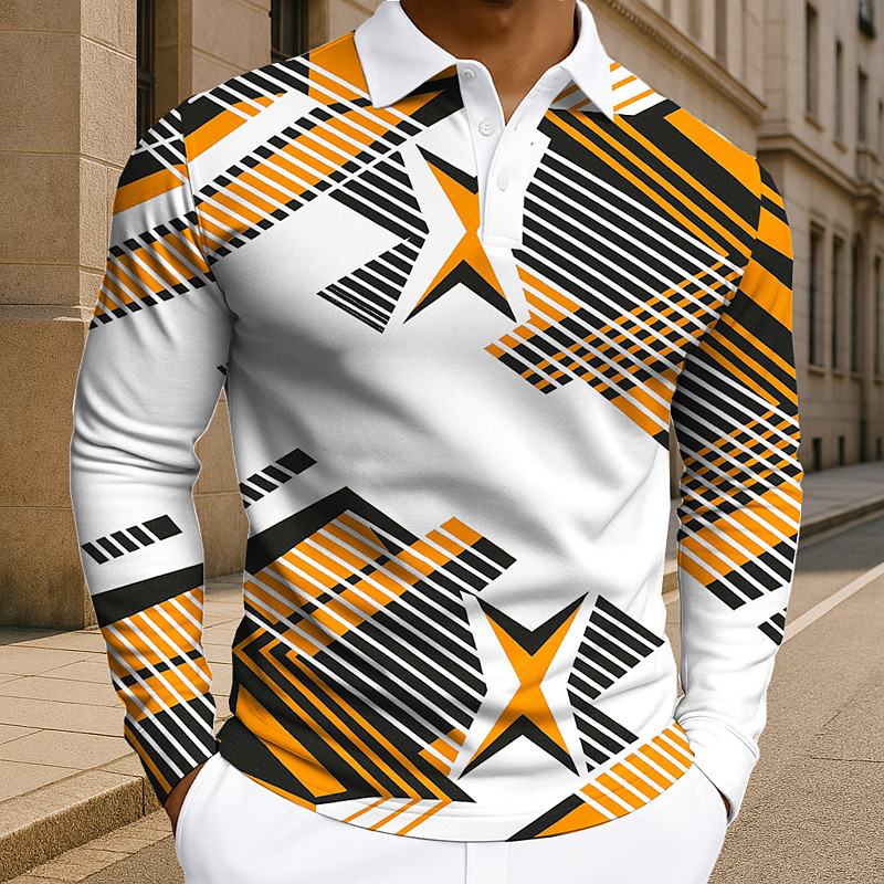 Men's Geometic Polo Long Sleeve Polo Shirts Lapel Business Casual Athleisure Daily Wear 3D Print Buttons Spring Fall Winter Red Blue Orange