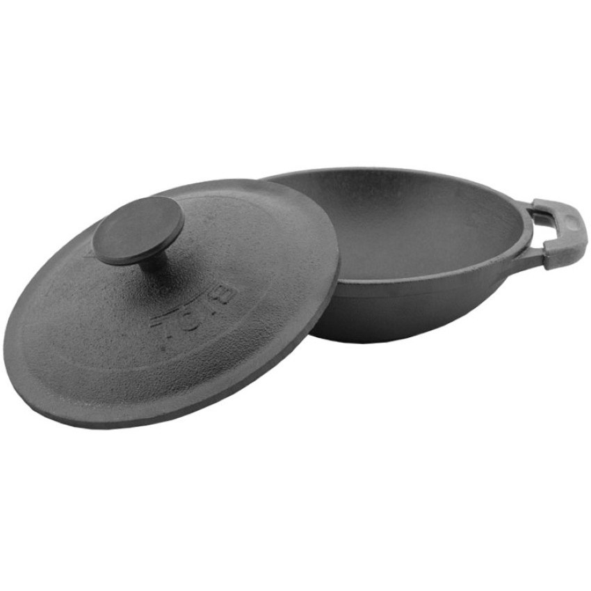 BIOL Servierpfanne 14 cm aus Gusseisen emailliert Wok-Pfanne mit Holzbrett Gusswok Emaillie