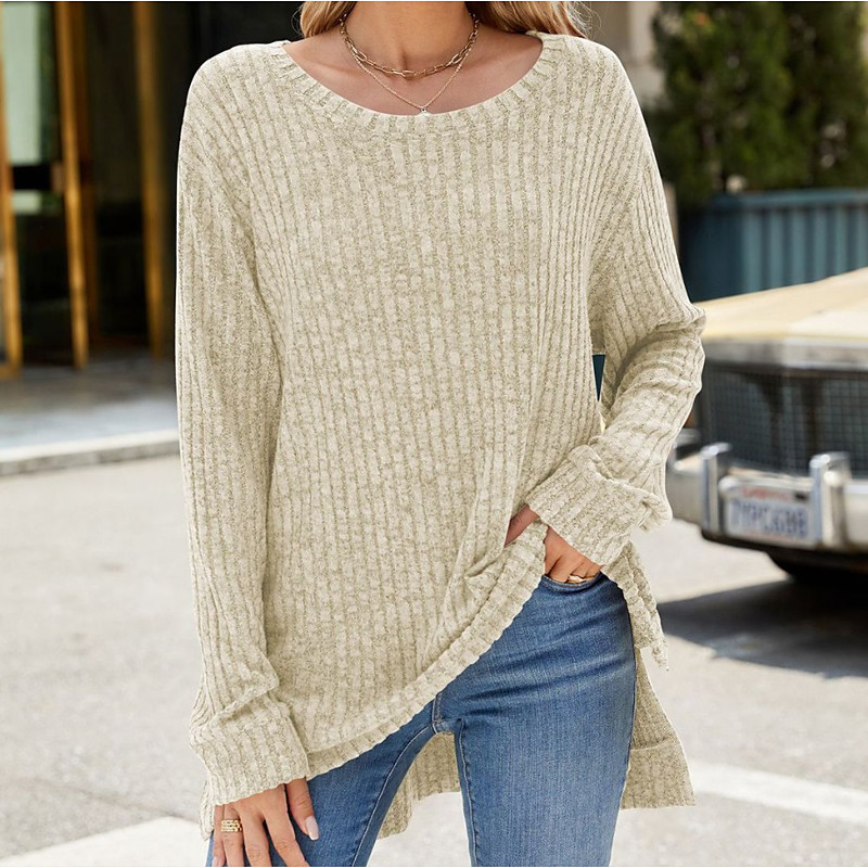 Women's Sweater Casual Soft Pure Color Ribbed Crew Neck Knitted Long Sleeve Regular Tops Knit Outdoor Daily Weekend Blue Light Grey Fall Winter