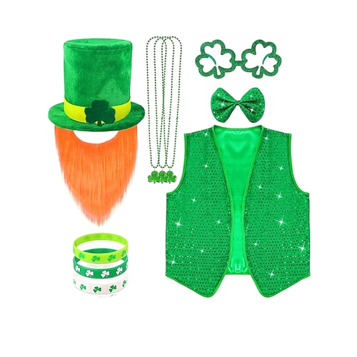 Grüner Koboldhut für Herren zum St. Patrick's Day, Bart, Weste, Halskette, Fliege Armbandset – das perfekte festliche Outfit für die Feierlichkeiten zum St. Patrick's Day