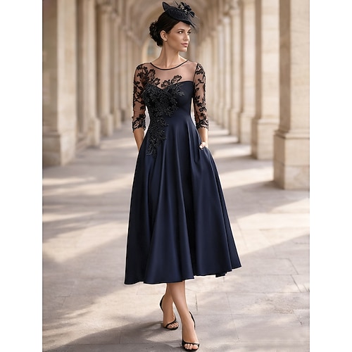 Linea ad A Lunghezza Tè Perline ricamate Abito Formale Abito da madre della sposa Abiti da Cocktail Abiti da festa Elegante Manica 3/4 Girocollo Festa in giardino Matrimonio Raso Pizzo con Pieghe