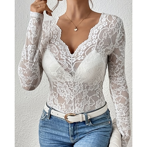 Per donna Blusa Top in pizzo Semplice Elegante Sexy Manica Lunga Scollo a V Top Regolari Quotidiano Ferie Uscire Pizzo Nero Bianco Vino Blu marino Verde smeraldo Autunno Inverno