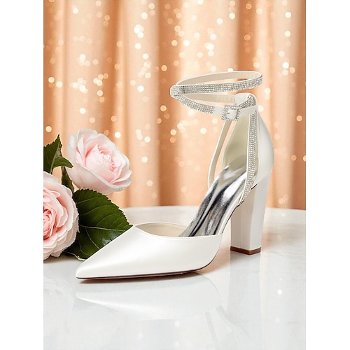 Weiße Brautschuhe mit Knöchelriemen aus Satin für Damen – spitze Hochzeitsschuhe mit Kristallanhänger für die Braut
