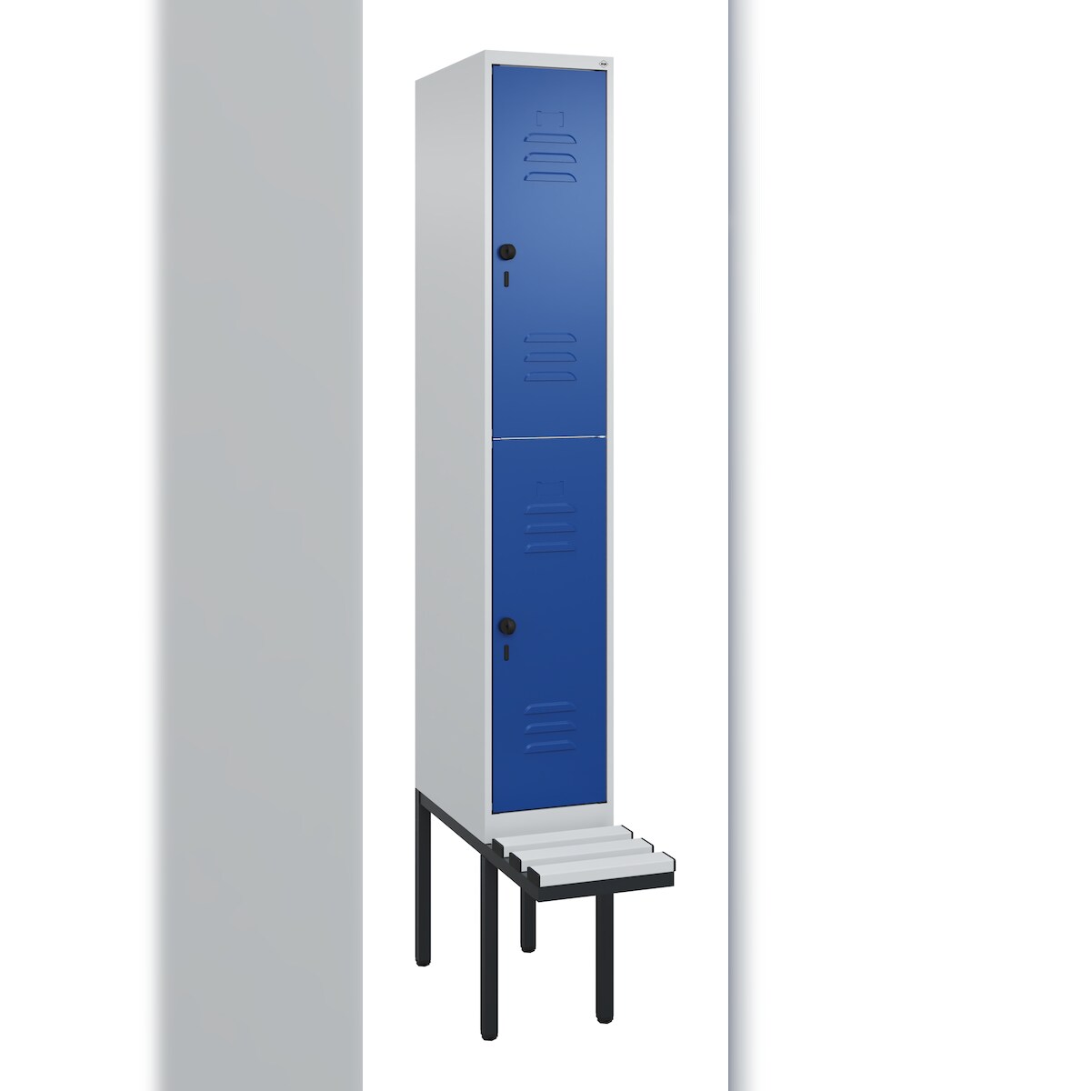 Spind Classic PLUS, 2 Abteile, lichtgrau / enzianblau, B 600 mm, mit Füßen, Drehriegel C+P