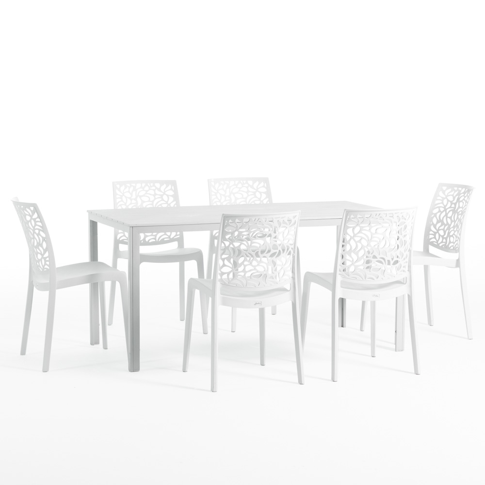 RATTATAN Gartenset mit Tisch und 6 Stühlen, rechteckiger Tisch mit Eisenstruktur und einteilige, stapelbare Stühle aus Harz – Thomas+Anna/Weiß-Weiß