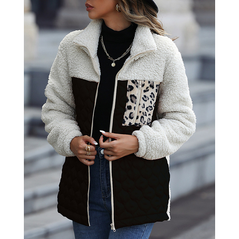 Women's Fleece Jacket Coat Warm Comfortable Patchwork Zipper Pocket Fashion Modern Casual Leopard Going out Weekend Zipper Regular Turndown Regular Fit Long Sleeve Outerwear Black Wine Army Green