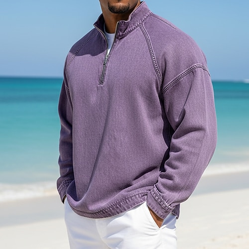 Per uomo Camicia 100% cotone lavaggio acido Maglietta Manica Lunga Collo alla coreana Primavera Autunno Autunno Inverno Semplice Vintage Streetwear Casual Con zip Base Casuale Casa Streetwear Blu