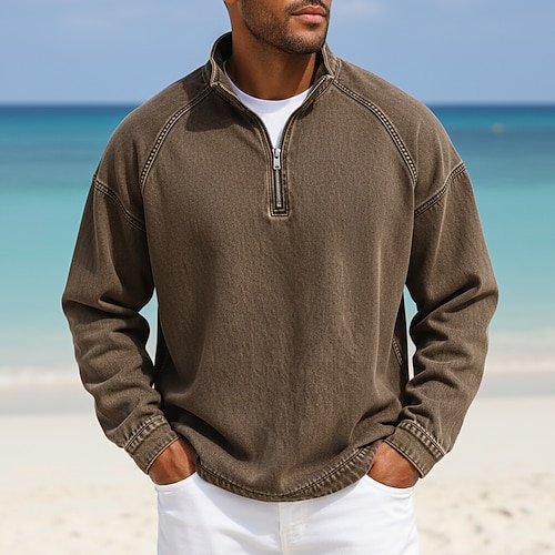 Per uomo Camicia 100% cotone lavaggio acido Maglietta Manica Lunga Collo alla coreana Primavera Autunno Autunno Inverno Semplice Vintage Streetwear Casual Con zip Base Casa Streetwear Casuale Nero