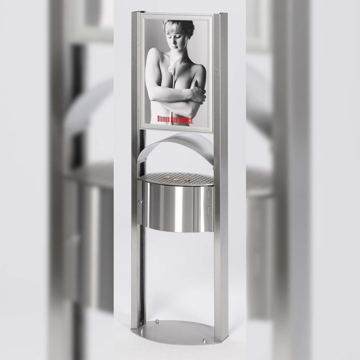 PROREGAL Robuster Standascher mit Schutzdach & Werbefläche für den Aussenbereich | 15 Liter, HxBxT 180x58x35cm | Edelstahl | Ascher Aschenbecher