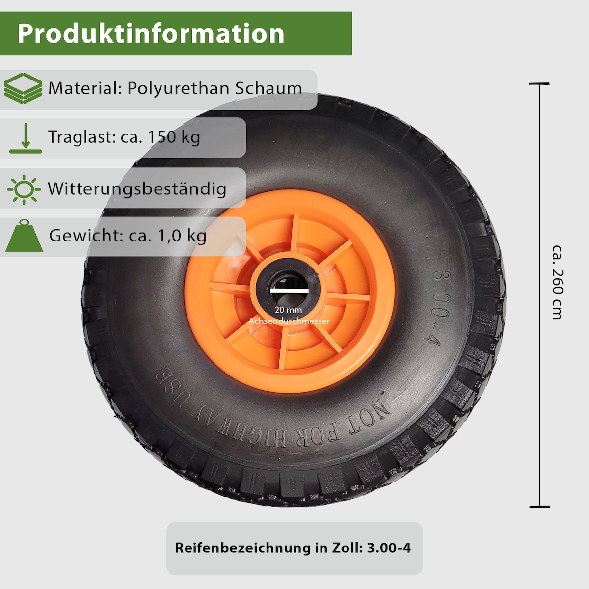 Baumarktplus Sackkarrenrad PU-Rad 260x85 mm 3.00-4 75 mm zentrierte Nabe Ø 20 mm orange Vollgummi Bollerwagen