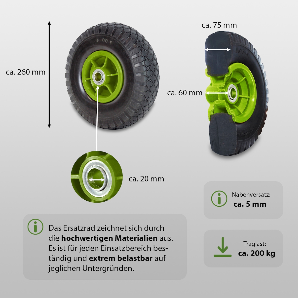 TRUTZHOLM 2x Sackkarrenrad PU-Rad 260x85 mm 3.00-4 60 mm versetzte Nabe Ø 20 mm grün Vollgummi Bollerwagen