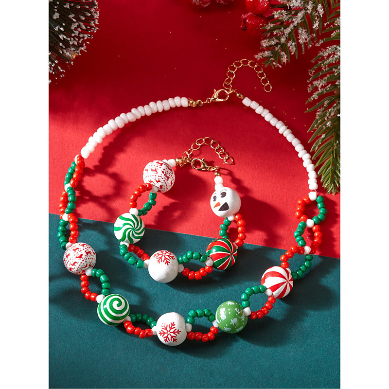 Women's Christmas Candy Cane Necklace Bracelet Set, Red and White Beaded Holiday Jewelry for Christmas Parties