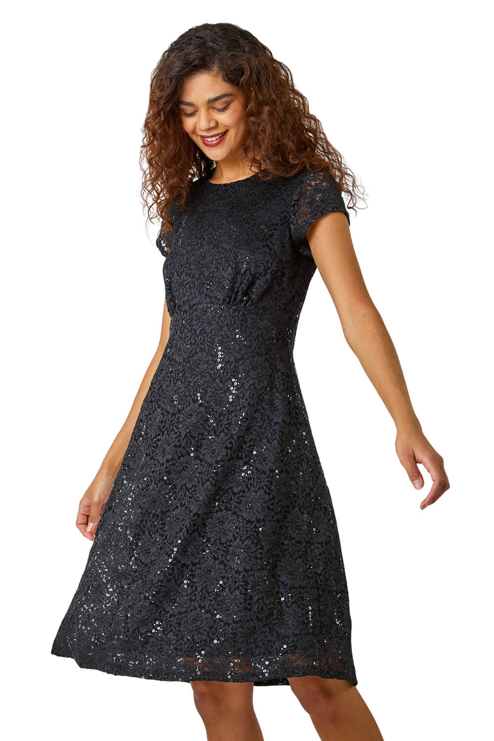 Roman Womens Sequin Fluted Hem Lace Stretch Dress - Black - Size 12 UK | Roman Sale | Discount Designer Brands