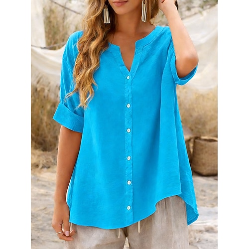 Blusa in cotone e lino da donna Colore solido Elegante Stiloso Base Maniche corte V collo Top regolari Quotidiano Blu Nero Viola Verde Beige Estate Primavera Autunno