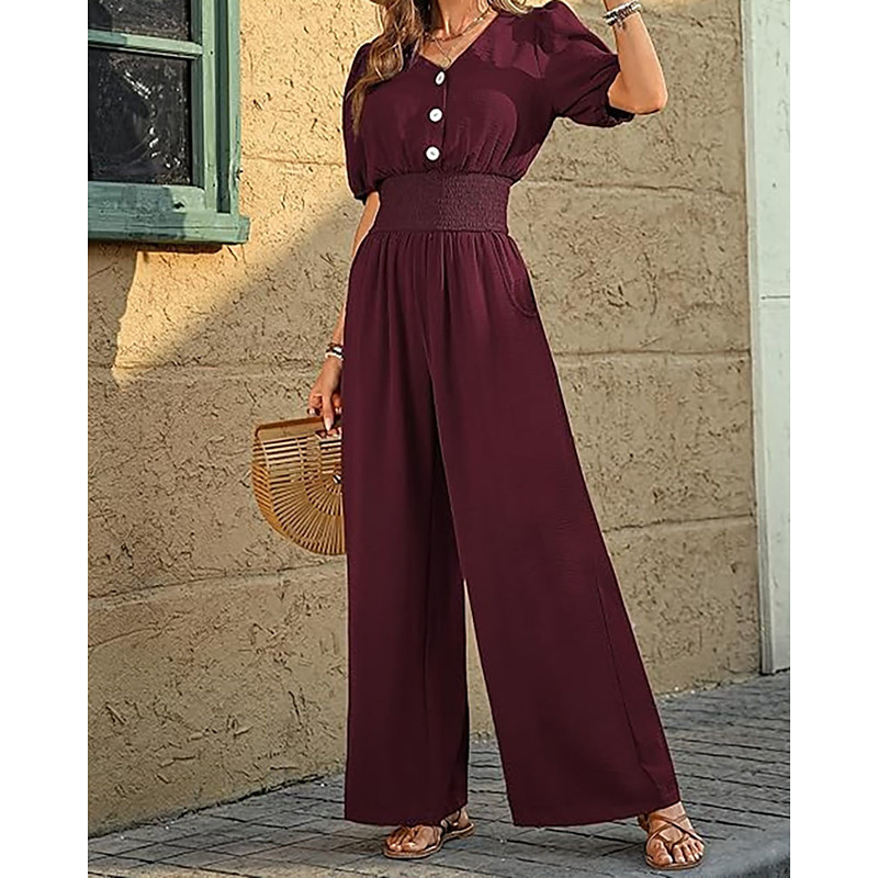 Women's Jumpsuit Elegant Solid Color Short Sleeve Wide Leg V Neck Pocket Buttons Vacation Daily Regular Fit Black Wine Army Green Summer