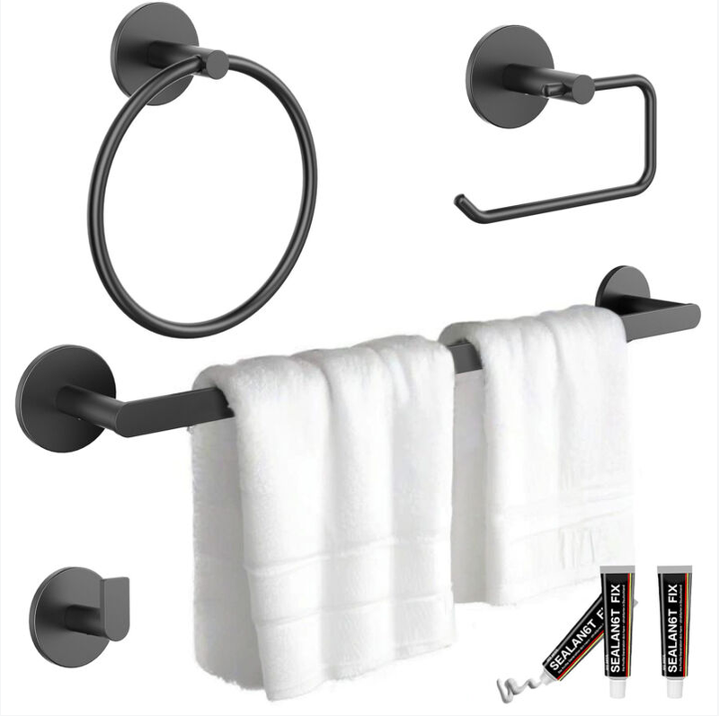 Ensemble d'accessoires de salle de bain 4 pièces en acier inoxydable : porte-serviettes, porte-papier toilette, anneau porte-serviettes et patère (noir)