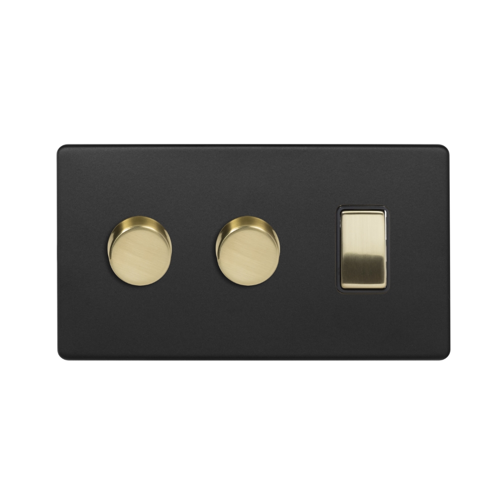 Soho Lighting Matt Black & Brushed Brass 3 Gang Dimmer and Rocker Switch Combo (2 x 2-Way Intelligent Dimmer & 1 x 2-Way Switch)