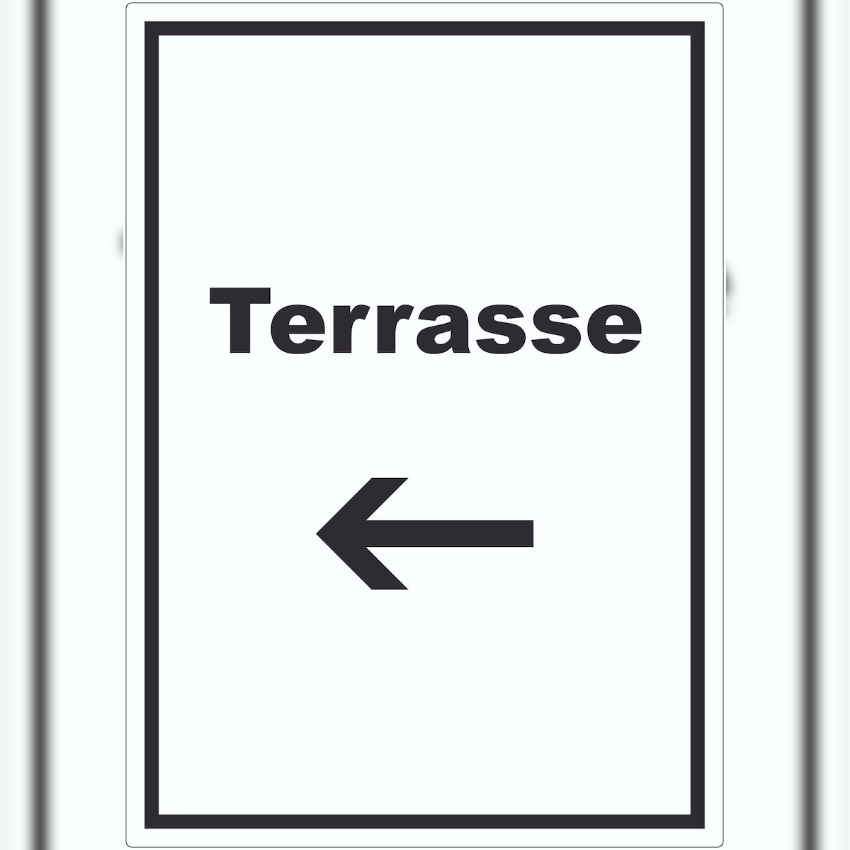 HB-Druck Terrasse Aufkleber mit Text und Richtungspfeil links hochkant A6 (105x148mm)