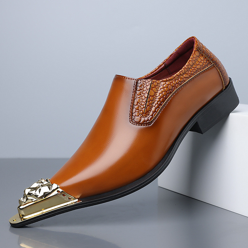 Men's Brown Faux Leather Slip-On Dress Shoes with Metal Toe Cap, Elegant Party and Business Formal Shoes