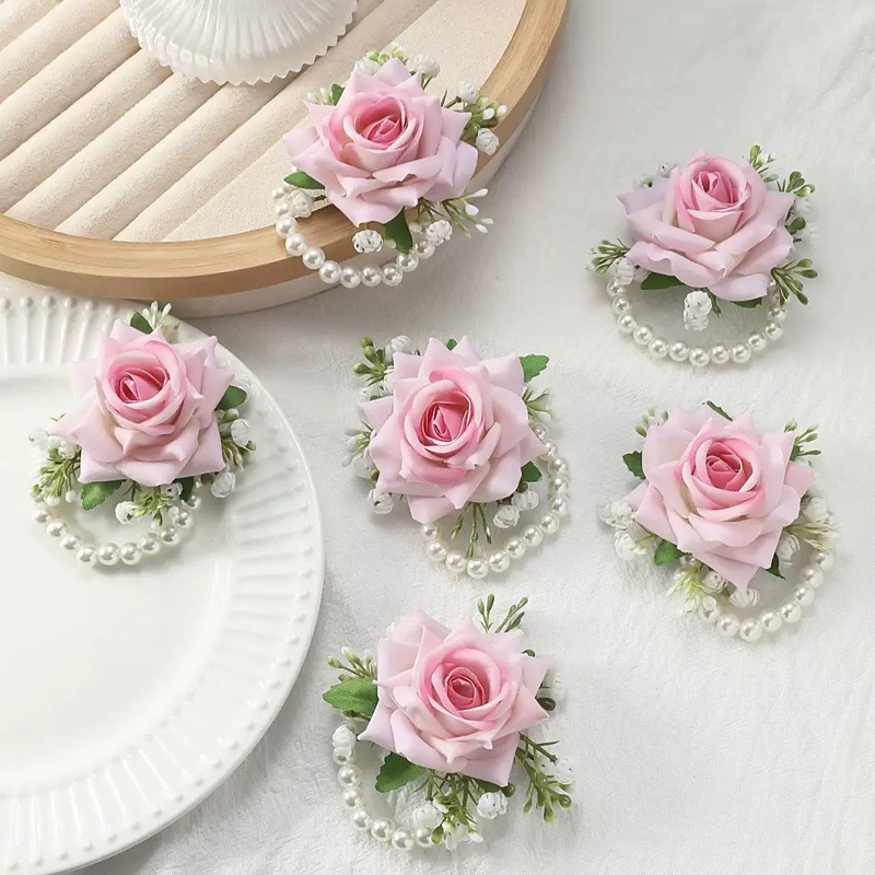 6PCS Valentine's Day Wedding Wrist Corsages – Realistic Foam Roses, Bridal Party Flower Accessories, Bridesmaid Bouquet, Wedding Aisle Decor, High-Quality Eternal Design for Gifts Events