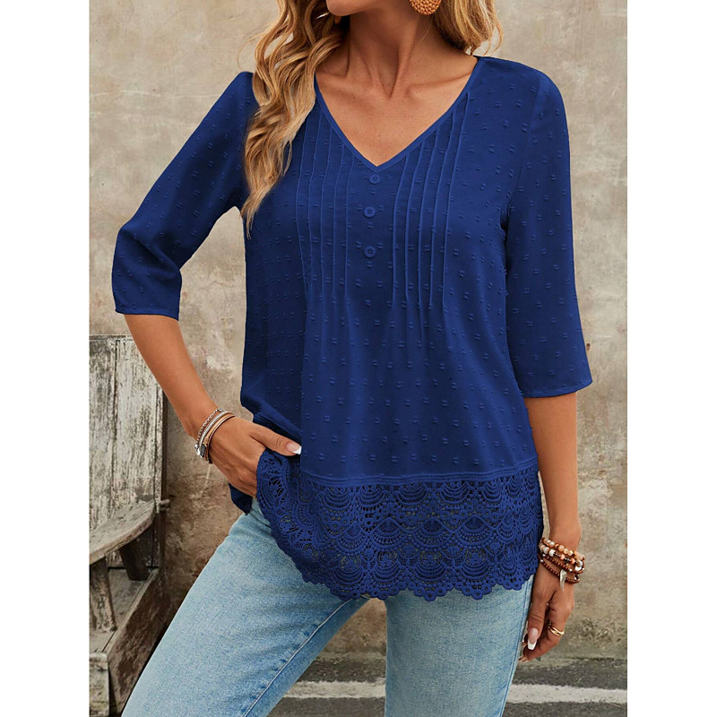 Women's Blouse Solid Color Elegant Stylish Casual 3/4 Length Sleeve V Neck Regular Tops Daily Lace Patchwork Buttons Blue Black White Pink Spring Fall