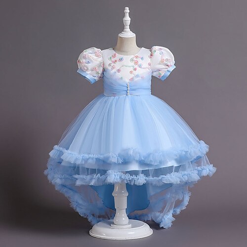 Abito da damigella d'onore bambina Ragazze Abito formale Abiti da sposa Feste Matrimonio Formale Adorabile Principessa Dolce Patchwork Rete Floreale Maniche Corte Girocollo Blu Rosa Dai 4 anni in su