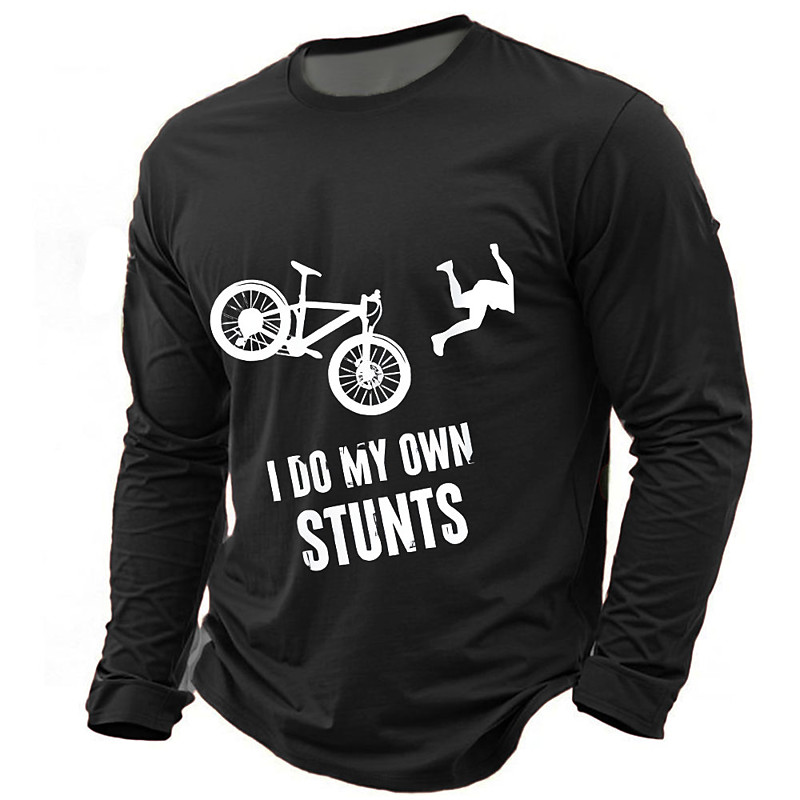 Men's Long Sleeve Graphic T-Shirt Funny 'I Do My Own Stunts' Cycling Bicycle Rider Humor Tee