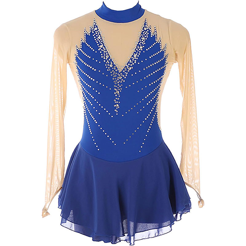 Figure Skating Dress Women's Girls' Ice Skating Dress Royal Blue Patchwork Open Back Mesh Spandex High Elasticity Training Practice Professional Skating Wear Classic Crystal / Rhinestone Long Sleeve