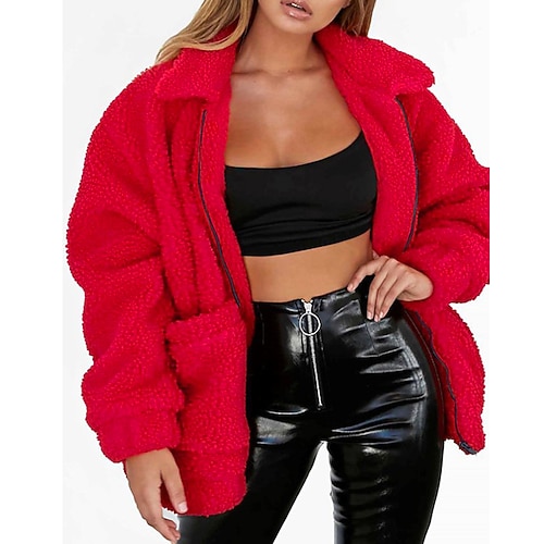 Damen Teddymantel Jacke Freizeitjacke Warm Bequem Reißverschluss Tasche Lässig Einfach Outdoor Urlaub Alltagskleidung Ausgehen Regulär Stehkragen Normale Passform Langarm Oberbekleidung Schwarz Rosa