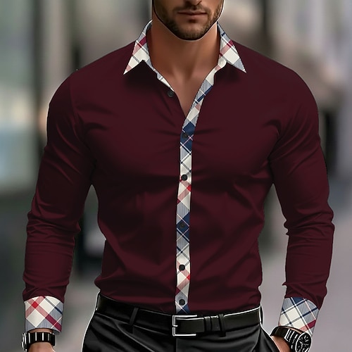 Herren Geometrisch Karo / Karomuster Glas Hemd Satinhemd Kleidhemd Langarm Business-Casual Urlaub Alltagskleidung Sommer Frühling Herbst Umlegekragen 3D-Druck Hemden mit Knopfleiste Dunkelrot