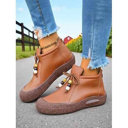 stivaletti da donna marrone chiaro con nappe con fiocco di perline – stivaletti bassi bassi in stile boho retrò per la guida, passeggiate informali e outfit autunnali