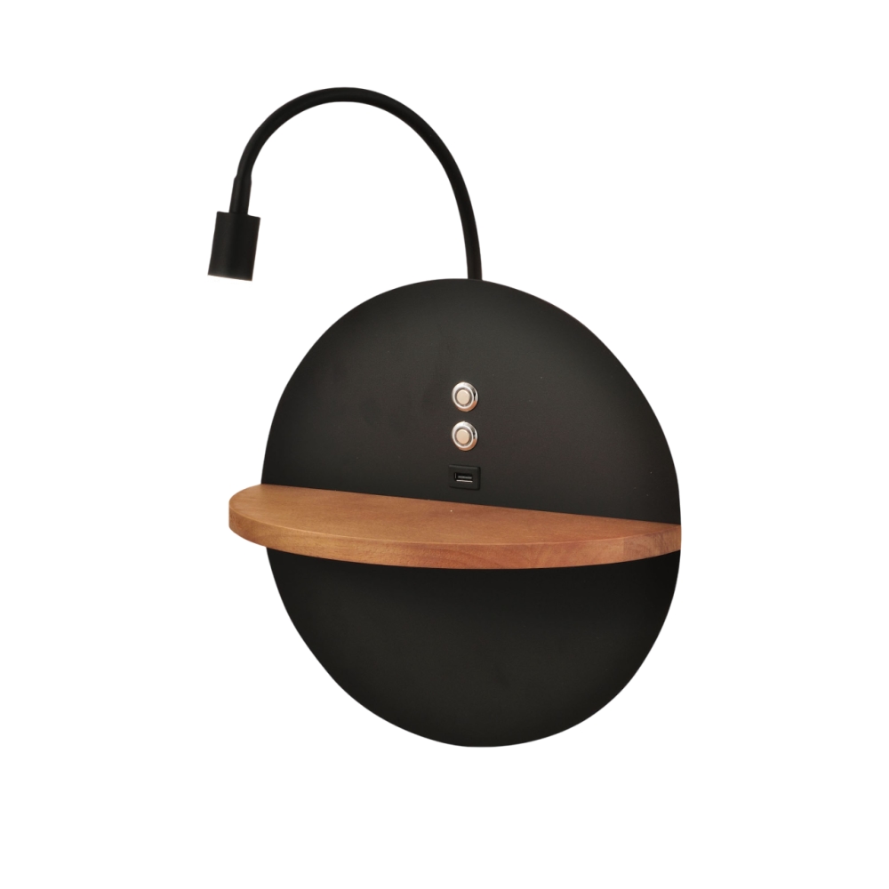 Dual - Wandleuchte mit Ablage und 15W LED-Leuchte Fabas Luce Touch Dimmer - Mattschwarz mit Holz integriertem USB