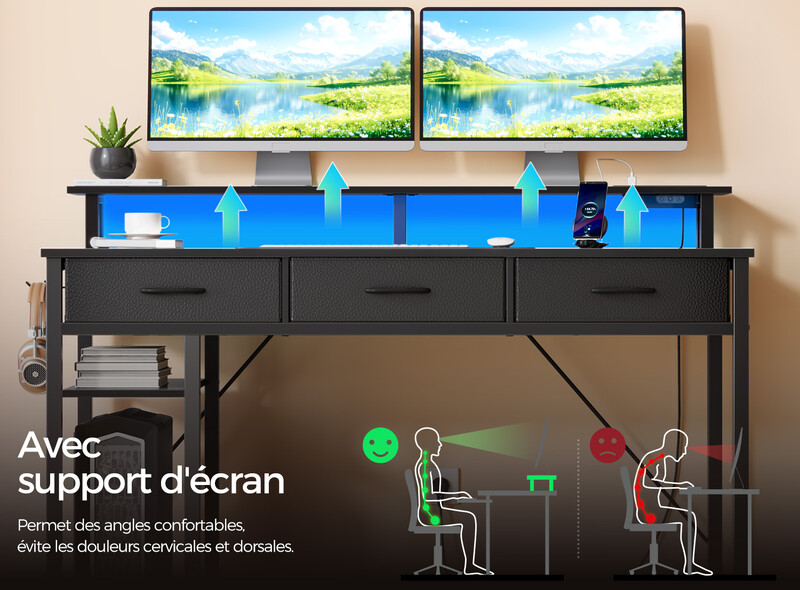 Rolanstar Bureau pour ordinateur avec ports USB, prises AC, LED, tiroirs & rangement Noir – 100 cm Standard UE