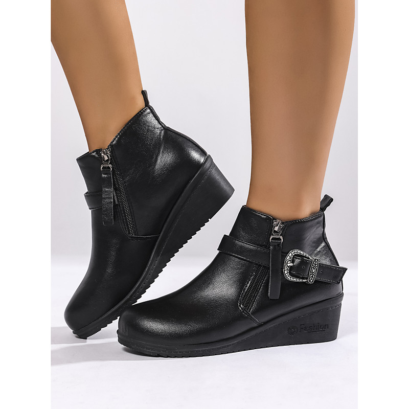 Women's Brown Faux Leather Wedge Ankle Boots – Side Zipper Booties with Buckle Strap, Comfortable Non-Slip Casual Winter Shoes