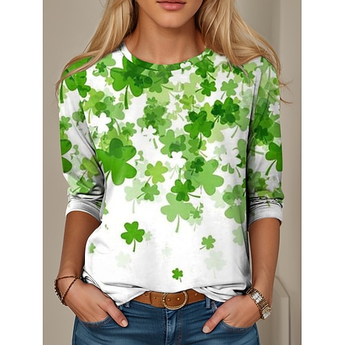 Maglietta da donna per il giorno di San Patrizio grafica quadrifoglio vintage alla moda moderna a manica lunga girocollo top regolari stampa quotidiana weekend bianco verde primavera inverno
