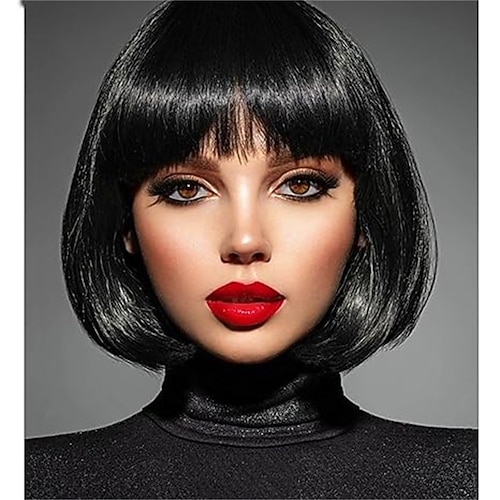 Parrucca Costume Cosplay Parrucca Sintetica Bob Dritto Frangia Ordinata con Frangia Parrucca Corto Nera Nera Rossa Arcobaleno Capelli Sintetici 12 pollici Donne Parrucca Sintetica Sexy Lady Nera
