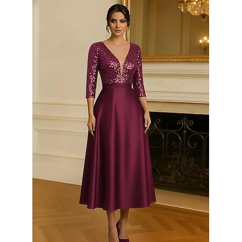 Linea ad A Lunghezza Tè Abiti da Cocktail Abiti da festa Abito svasato Elegante Manica 3/4 Scollo a V Festa in giardino Matrimonio Raso con Paillettes