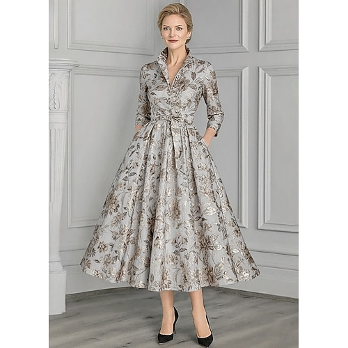 Linea ad A Lunghezza alla caviglia Abito da invitata a nozze Abito Formale Abito da sera Abito da cerimonia per signora Manica 3/4 Bavero Elegante Vintage Formale Ospite di nozze Semi-Formale Jacquard
