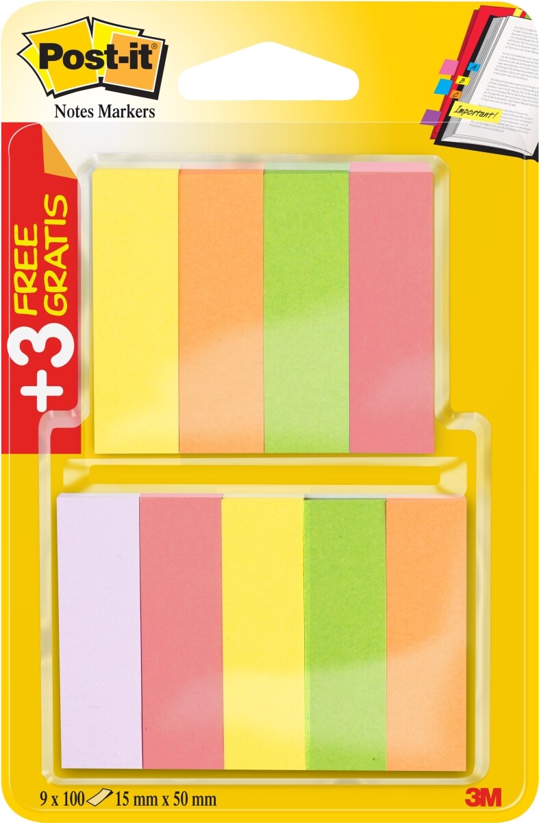Post-it Haftstreifen Page Marker schmal, 15x50mm 6 x100 Blatt+ 3x 100 Blatt neonfarben Packung mit 12 Stück