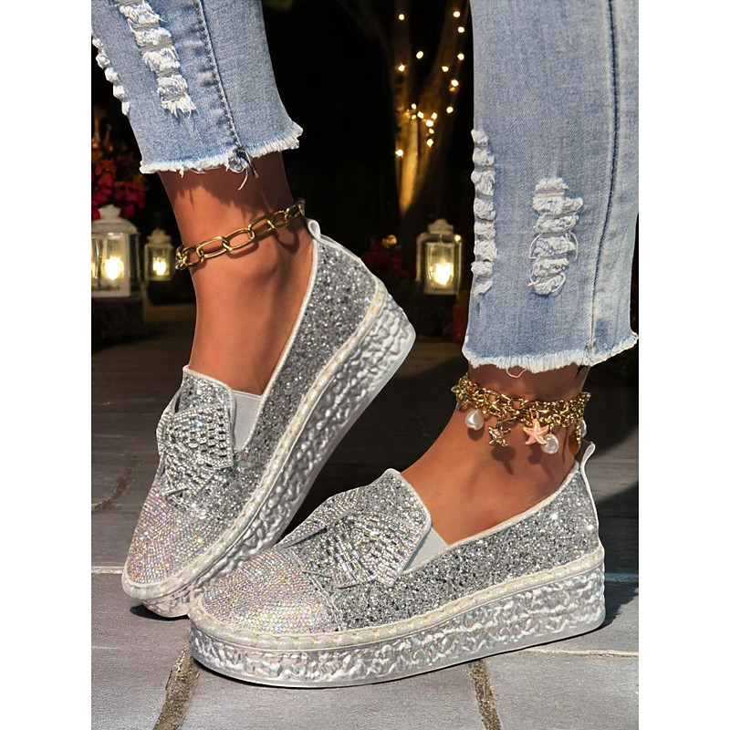 Women's Silver Glitter Platform Slip-On Shoes— Rhinestone Embellished, Cushioned Sole, Party-Ready Sparkle for Night Out, Festivals and Concerts